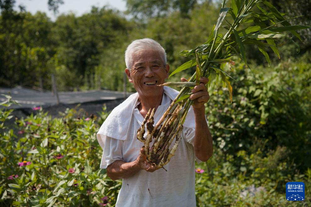 8月25日,在凯发k8省铜陵市义安区天门镇新华村,村民朱树清展示采收的铜陵白姜。新华社记者 张端 摄